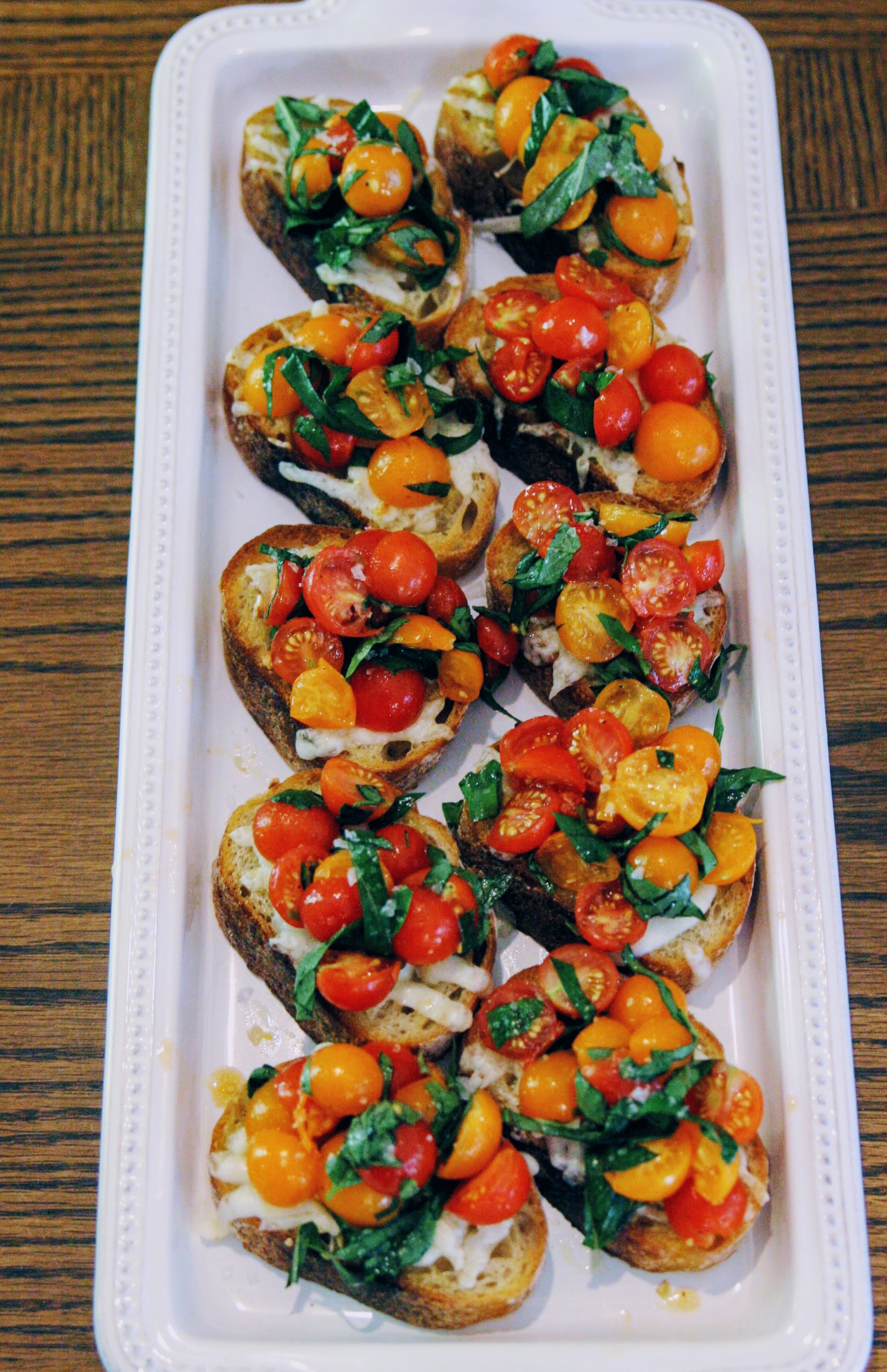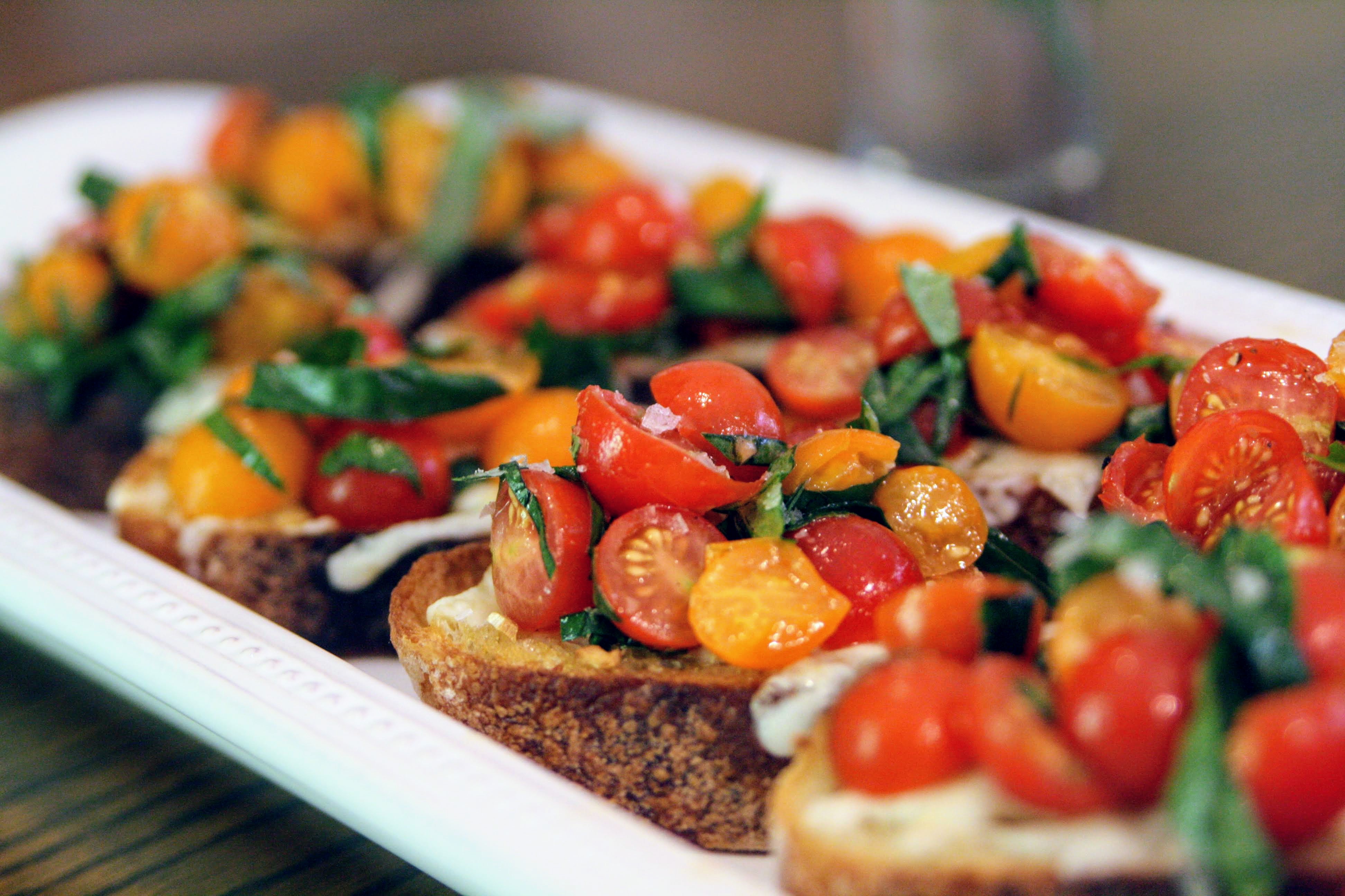 These are a delicious appetizer and if you’re not careful (speaking from direct experience here) can quickly turn into a whole meal on its own. Fresh, fragrant tomatoes are important – use the nicest ones you can get your hands on. These are best washed down with a glass of red wine.