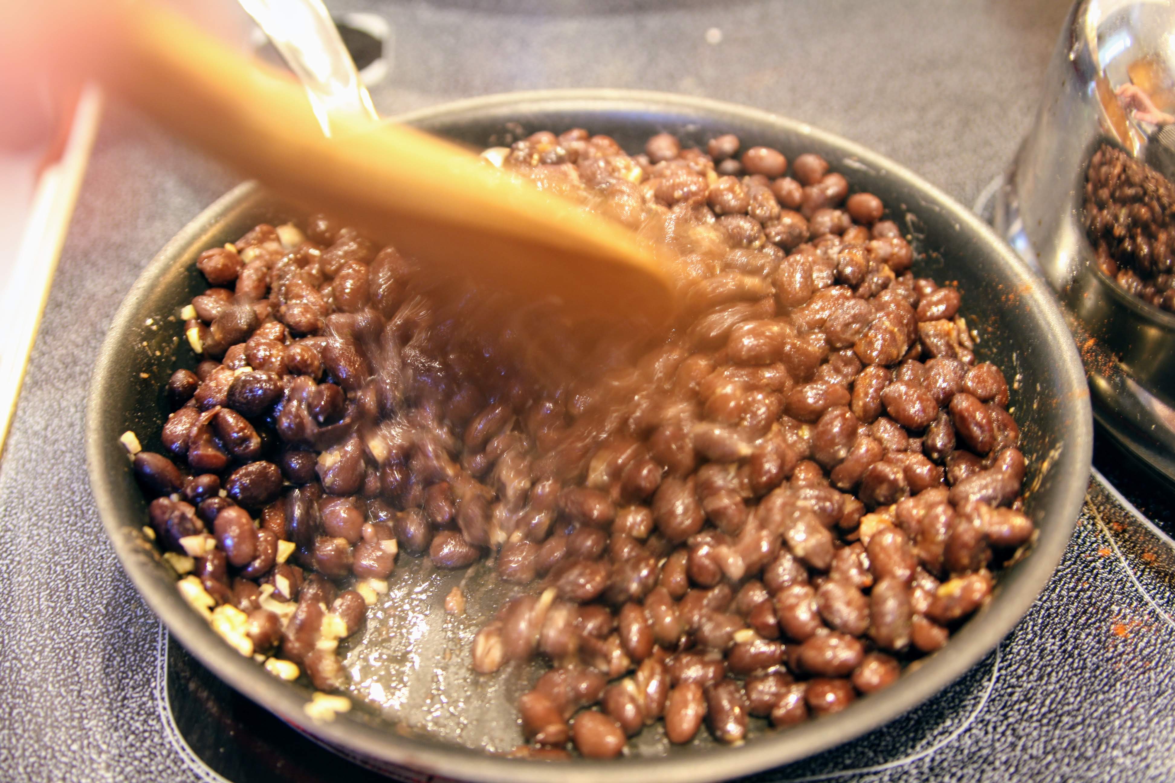 In a skillet, saute the garlic in the olive oil until fragrant, about 4 minutes. Add the beans and cook over medium heat until warmed through. Reduce the heat to low and add the cumin, coriander, and salt. Taste and make any adjustments (a little bit of cayenne is good here too). Keep the beans warm on low until your tortillas are ready.