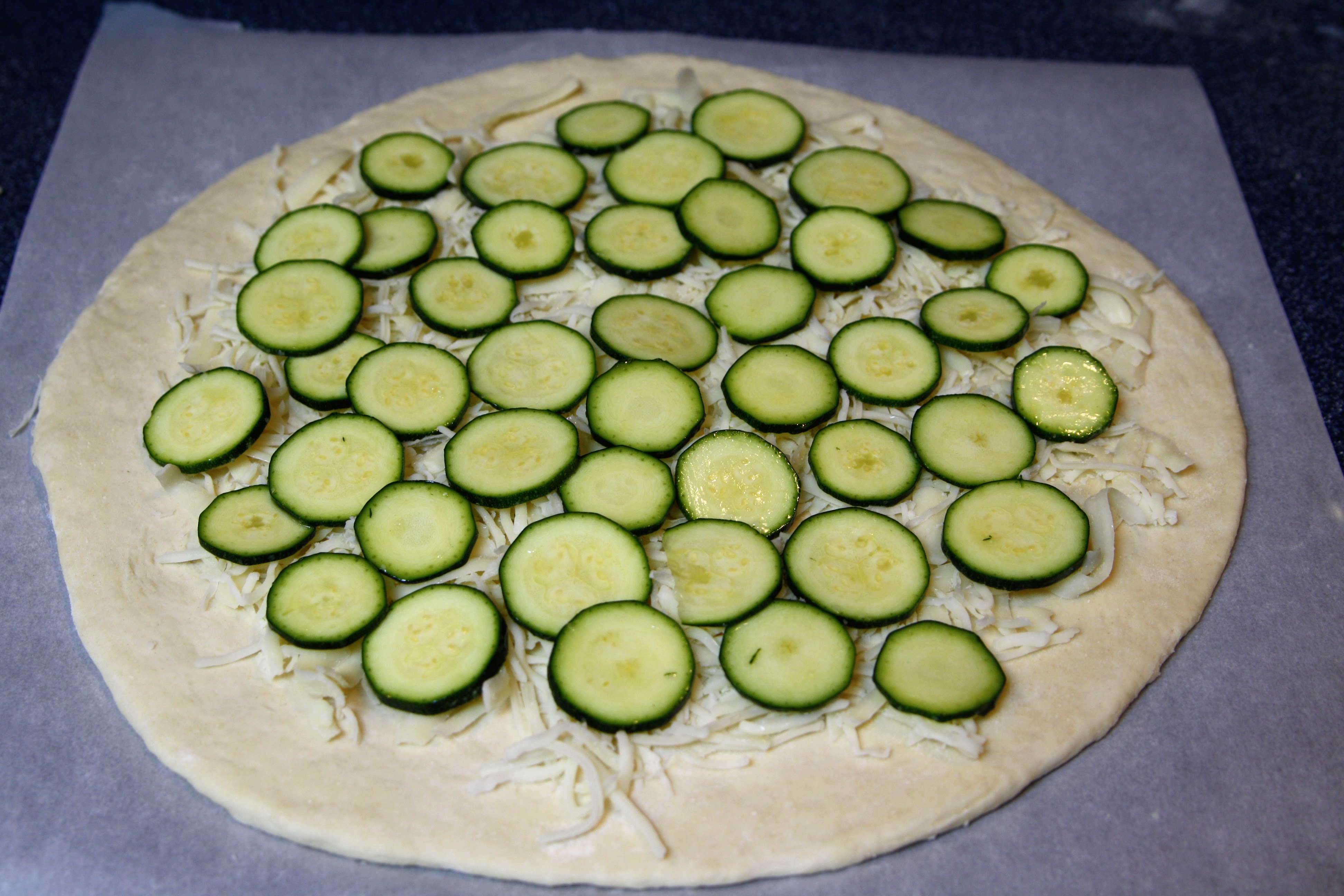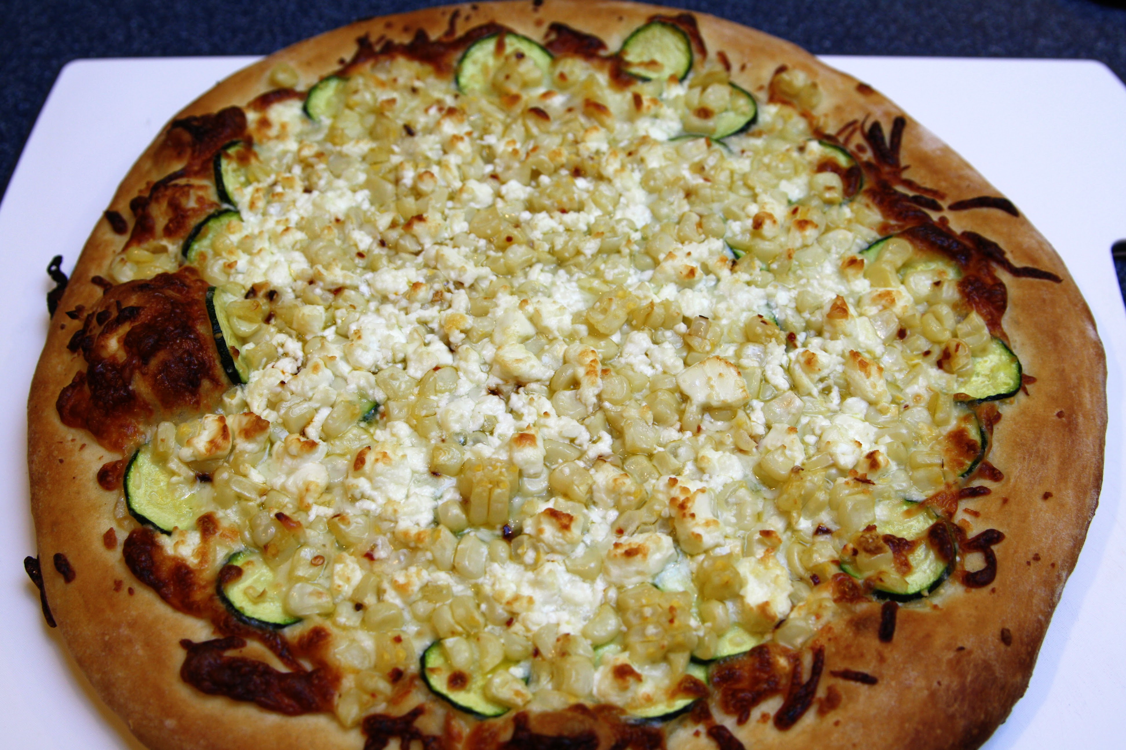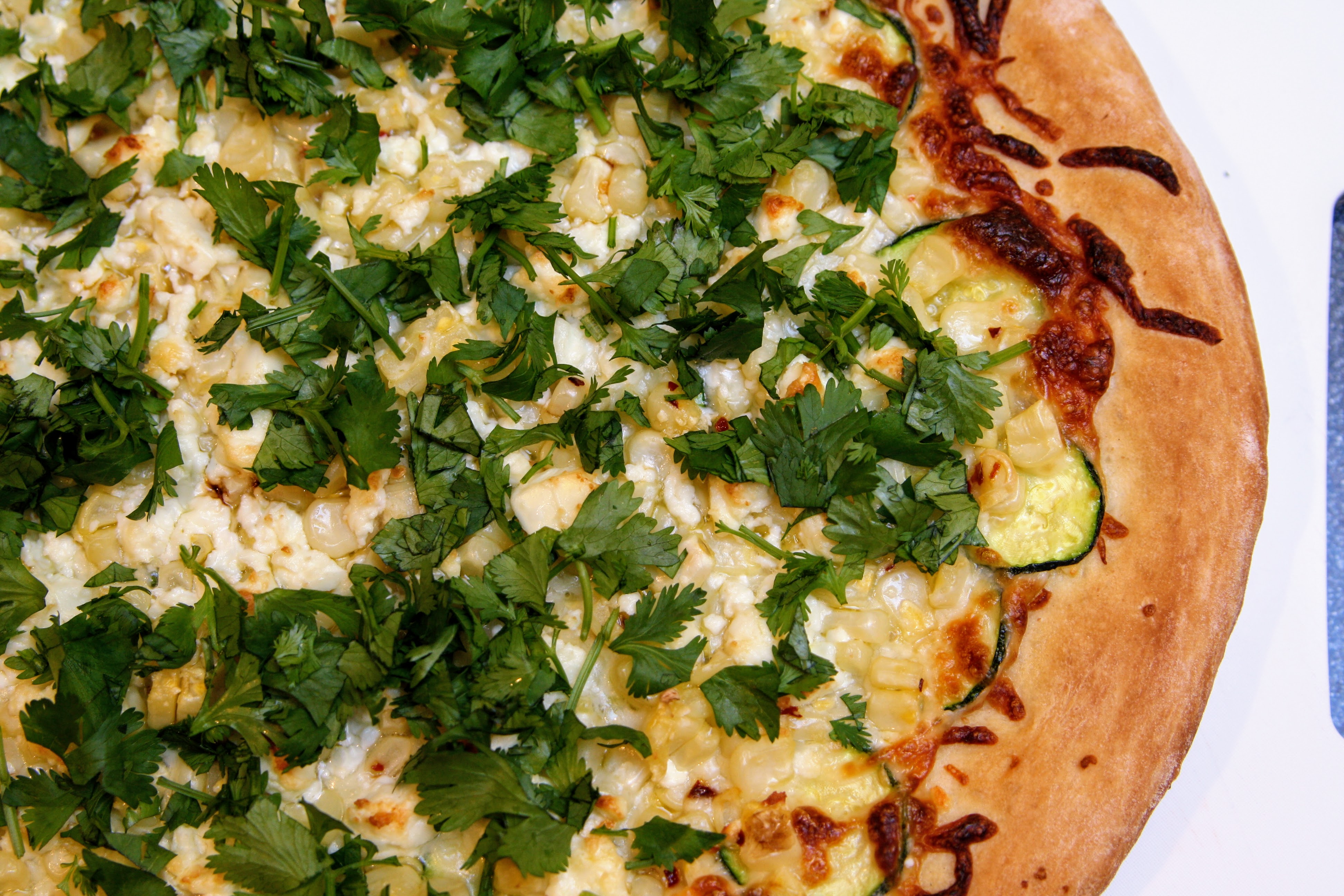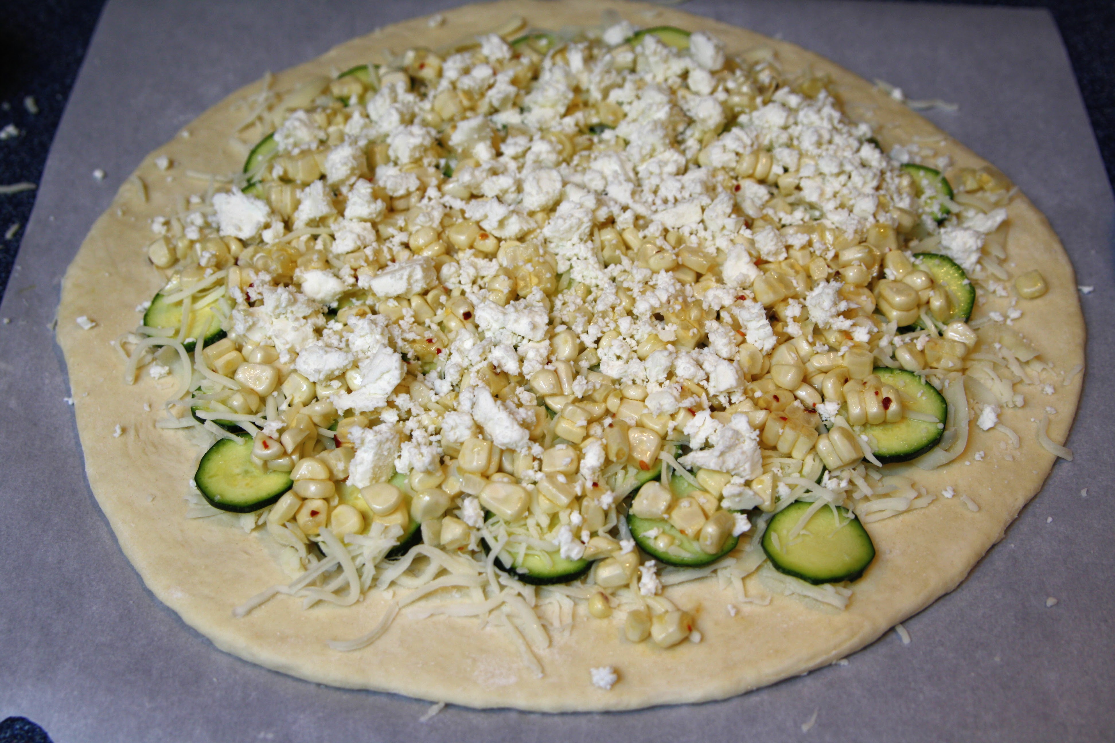 On a lightly floured sheet of parchment paper, roll the pizza dough out into roughly a 13-14-inch circle. Spread 1 cup of mozzarella out over the dough, leaving a gap around the edges. Spread the zucchini rounds out over the cheese in a single layer. Scatter the remaining ½ cup mozzarella over the zucchini, then add the corn, and top with the feta.